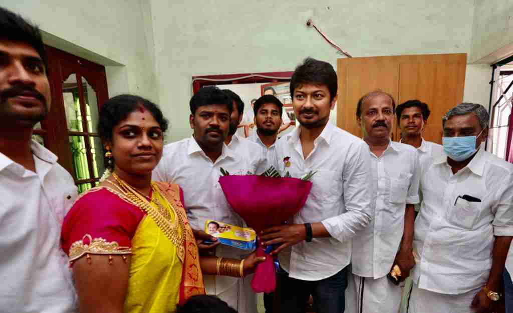 திருவாரூர் மாவட்டம் மன்னார்குடி சட்டமன்ற தொகுதி நீடாமங்கலம் தெற்கு திமுக ஒன்றிய செயலாளர் வை.மாயவநாதன் அவர்கள் இல்ல திருமண வரவேற்பு நிகழ்ச்சியில் 30-11-2020 அன்று கலந்து கொண்ட திரு. உதயநிதி ஸ்டாலின் அவர்கள் மணமக்களை வாழ்த்தி அவர்களுக்கு பரிசு வழங்கினார் .