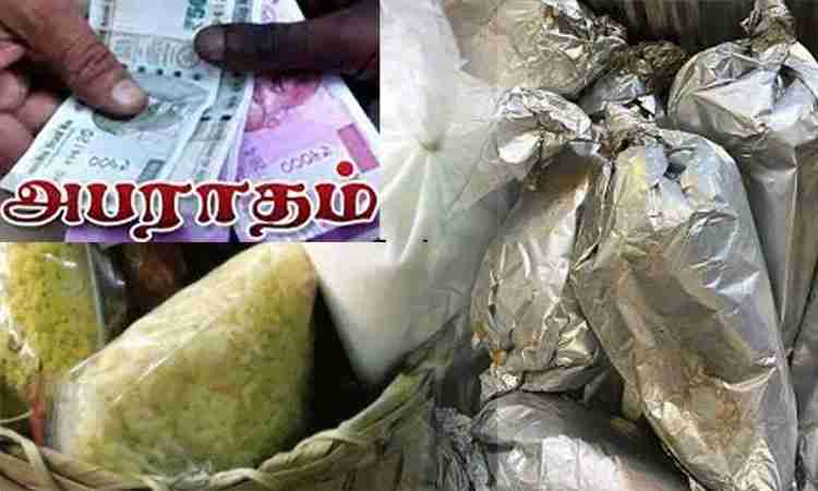பிளாஸ்டிக் பேப்பர், கவர்கள், சில்வர் பாயில் கவர் போன்றவற்றில் உணவுகளை கட்டிக் கொடுத்தால், முதல் முறை பிடிபடுபவர்களுக்கு ரூ.5,000 அபராதம் விதிக்கப்படும் என்றும், தடையை மீறினால் உணவு பாதுகாப்புத்துறை சட்டப்படி கடை உரிமம் ரத்து செய்யப்படும் என்று எச்சரிக்கை விடுக்கப்பட்டுள்ளது.