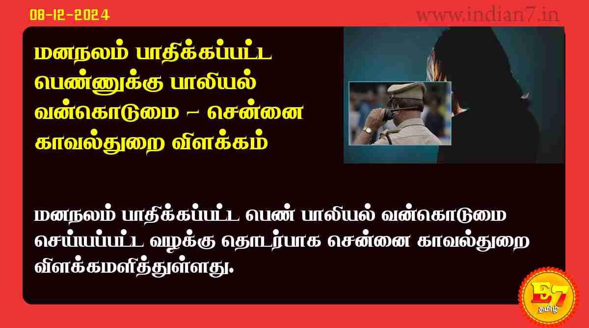 இந்நிலையில் இந்த விவகாரம் தொடர்பாக சென்னை காவல்துறை தரப்பில் அளிக்கப்பட்டுள்ள விளக்கத்தில், "மனநலம் பாதிக்கப்பட்ட பெண் பாலியல் வன்கொடுமை செய்யப்பட்ட வழக்கு தொடர்பாக 4 சிறப்பு படைகள் அமைக்கப்பட்டு விசாரணை நடத்தப்பட்டு வருகிறது. இந்நிலையில், வழக்கு விசாரணையை விமர்சிக்க வேண்டாம்.