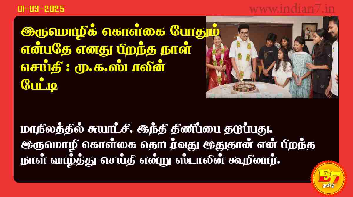 தொடர்ந்து பிறந்த நாளை முன்னிட்டு கோபாலபுரத்தில் உள்ள இல்லத்தில் தாயார் தயாளு அம்மாவை சந்தித்து மு.க ஸ்டாலின் ஆசி பெற்றார். பின்னர் செய்தியாளர்களுக்கு பேட்டி அளித்த ஸ்டாலின் "மாநிலத்தில் சுயாட்சி, இந்தி திணிப்பை தடுப்பது, இருமொழி கொள்கை தொடர்வது இதுதான் என் பிறந்த நாள் வாழ்த்து செய்தி" என்று கூறினார்.