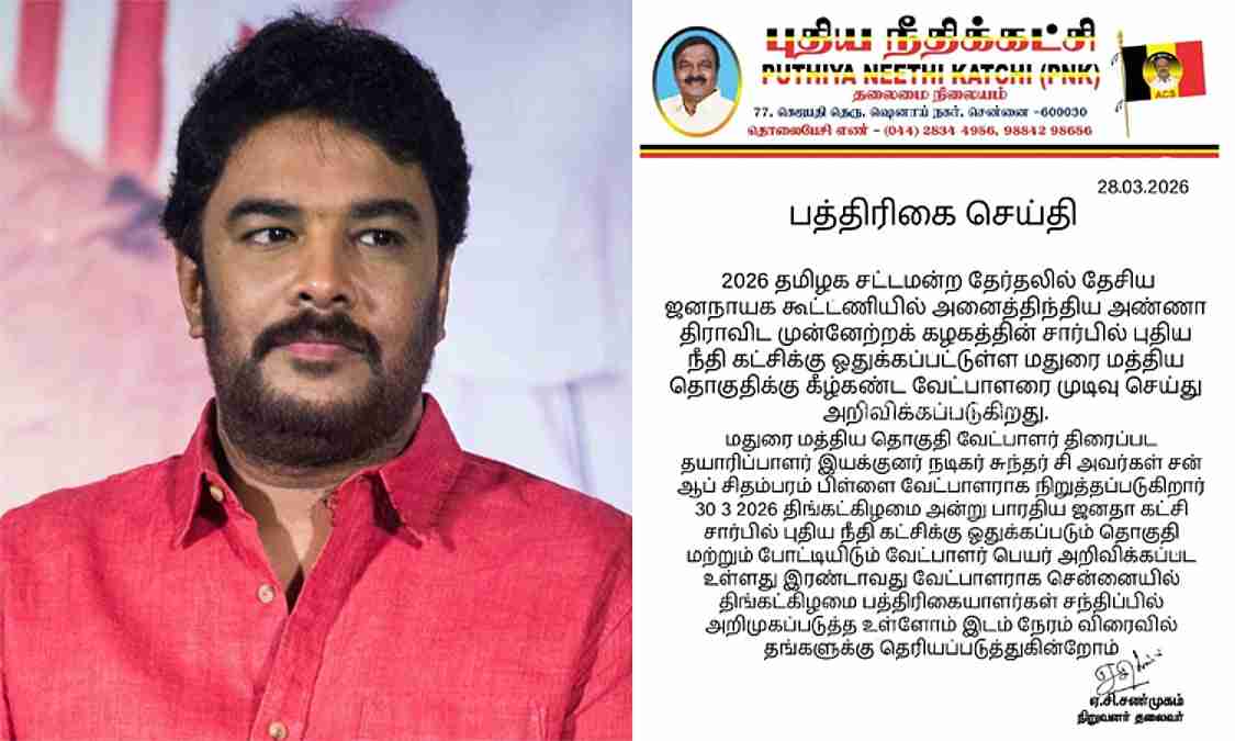 மதுரை மத்திய தொகுதி வேட்பாளர் திரைப்பட தயாரிப்பாளர் இயக்குனர் நடிகர் சுந்தர் சி அவர்கள் சன் ஆப் சிதம்பரம் பிள்ளை வேட்பாளராக நிறுத்தப்படுகிறார். 30.3.2026 திங்கட்கிழமை அன்று பாரதிய ஜனதா கட்சி சார்பில் புதிய நீதி கட்சிக்கு ஒதுக்கப்படும் தொகுதி மற்றும் போட்டியிடும் வேட்பாளர் பெயர் அறிவிக்கப்பட உள்ளது. இரண்டாவது வேட்பாளராக சென்னையில் திங்கட்கிழமை பத்திரிகையாளர்கள் சந்திப்பில் அறிமுகப்படுத்த உள்ளோம். இடம் நேரம் விரைவில் தங்களுக்கு தெரியப்படுத்துகின்றோம்.